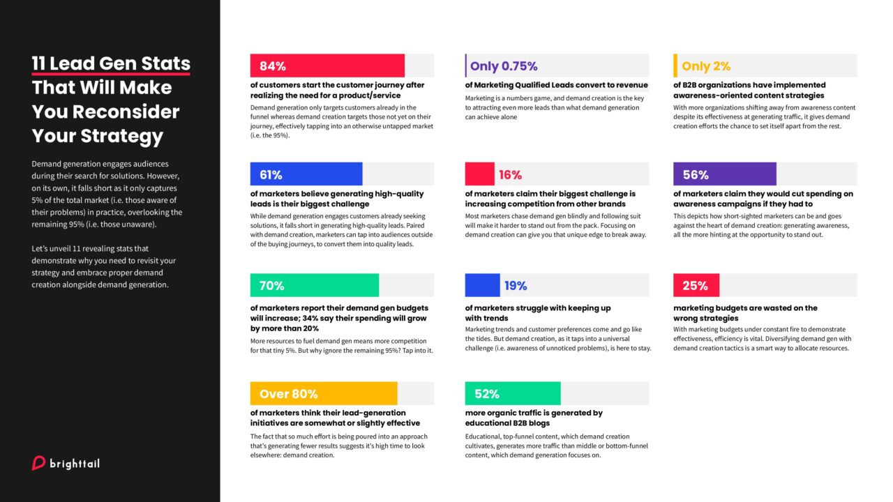 Essentially, to tap into the remaining 95%, you need to start creating demand. Through a blend of thought leadership, brand building, and content marketing efforts, unaware audiences can be informed and converted into leads, effectively going beyond the limits of demand generation.